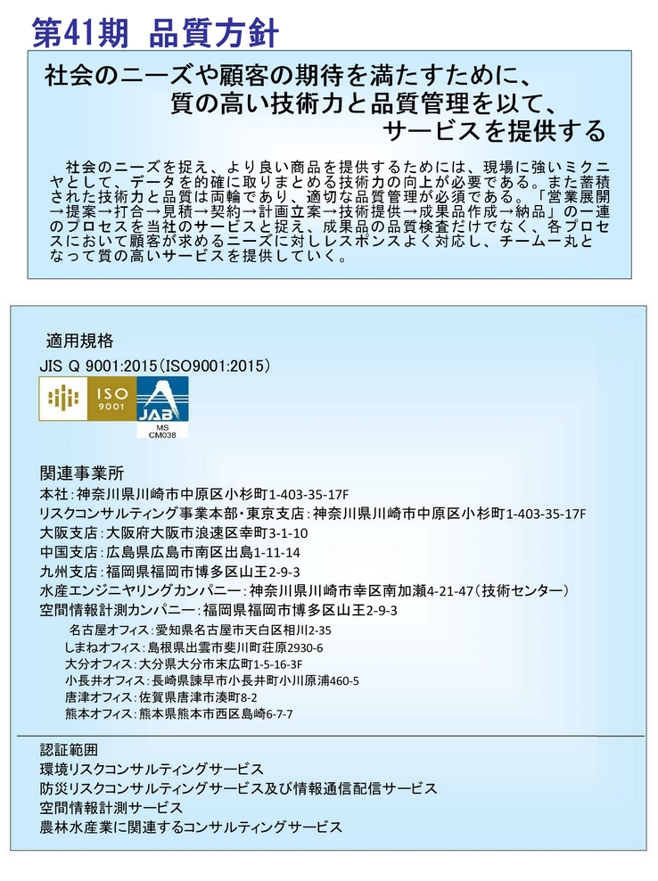 また、経済効率を追求しながら、自然や環境を大切にし、安心安全に配慮した持続可能な 社会を構成する時代へと大きく変化しています。そのような大きな社会環境の変化、 価値観の変化のなか、私たちは、社会的に重要なDX等の調査・解析・評価技術を 取り入れながら、コンサルティングスキルにより対策・提言までマネジメントできる、 防災と環境のリスクコンサルタント企業として様々な課題に対応していく 必要があります。