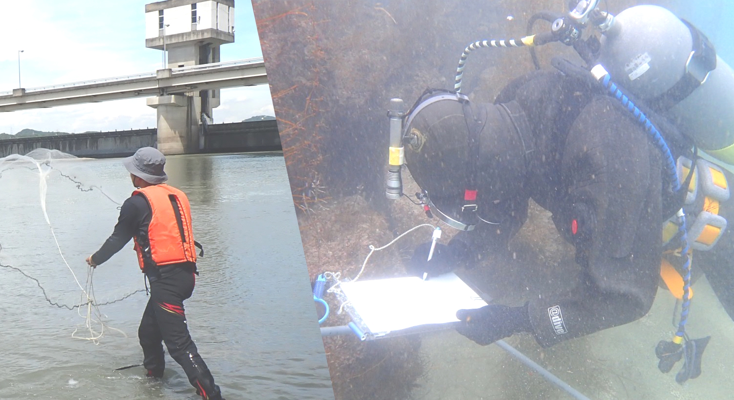 魚類調査をはじめ、河川水辺の国勢調査などに関する基礎調査にすべて対応可能であり、事前調整から現地調査、データの入出力システムに至るまで、一貫した対応を行っています。また、住民参加型の現地調査における技術指導や調査も実施しています。さらに、環境DNA分析の併用など、新しい取り組みも行っています。